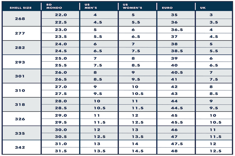 Ski Boot Sizing Chart and Mondopoint Conversion Table